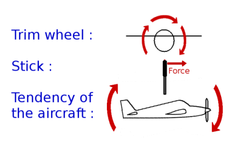The more you turn the trim wheel forward, the more the stick will push your hand forward. If you don't hold it still, your plane will stabilize a lower pitch (which is not what we want - you are piloting the plane, not the opposite) :